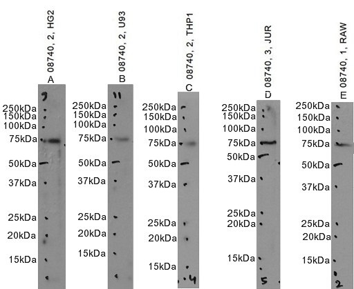 Approx. 75kDa band observed in lysates of cell lines HepG2, U937, THP-1, Jurkat and RAW264.7 (calculated MW of 74.2kDa according to Human NP_058198.2 and 74.1kDa according to Mouse NP_033723.1). Recommended concentration: 1-3µg/ml. Primary incubation 1 hour at room temperature.