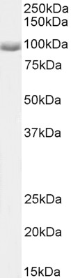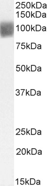 Approx 90-100kDa band observed in lysates of cell line HepG2 (calculated MW of 92.4kDa according to NP_001358344.1). Recommended concentration 0.5-2ug/ml. Primary incubation 1 hour at room temperature.