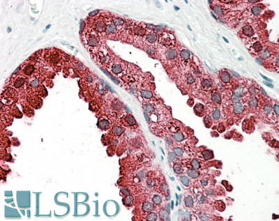 IHC Results In paraffin embedded Human Prostate shows reticulate cytoplasm staining, more intens towards the lumen of the gland. Recommended concentration, 3-5µg/ml. | |