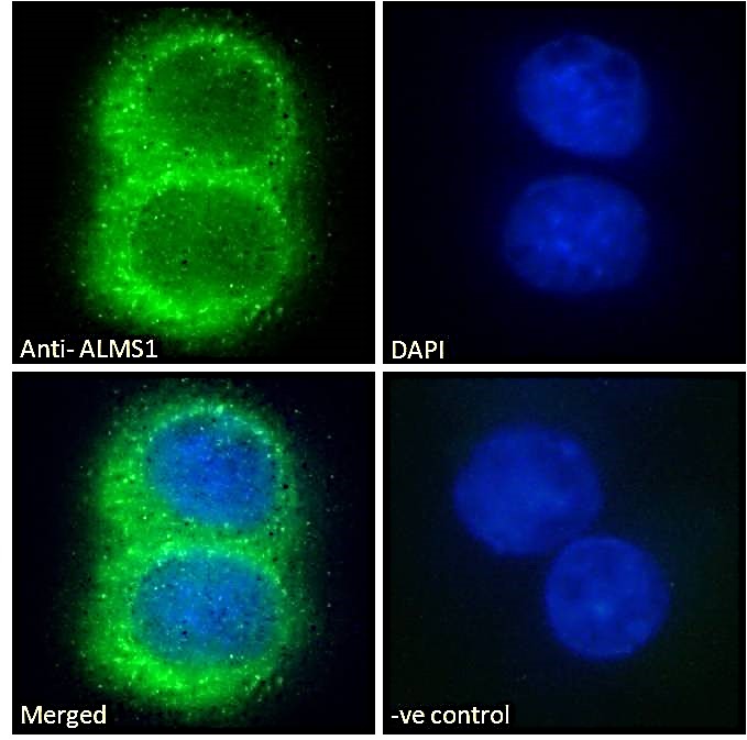 Product Comments The C terminus of ALMS1 shares an 8 amino acid stretch with two other human proteins: hypothetical protein (XP_169104) and ERAL1 (NP_005693). However, this stretch is located internally in these two proteins and so will most likely not cross-react with this antibody. The N terminus was not chosen as the peptide is expected to cyclise during synthesis. | |