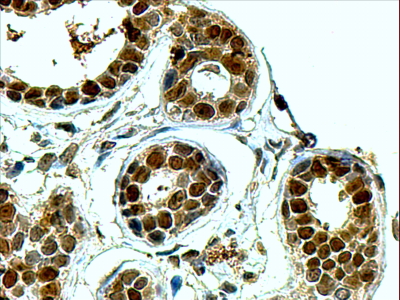 IHC Results In paraffin embedded Human Breast shows nuclear staining of lobular epithelial cells. Recommended concentration: 4-6µg/ml. | |