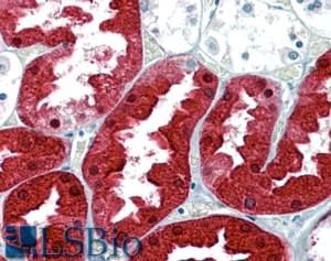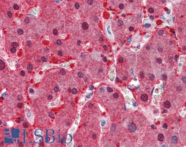 In paraffin embedded Human Kidney shows textured cytoplasm staining in PCT. Recommended concentration: 2-4µg/ml. Paraffin embedded Human Liver. Recommended concentration: 2.5µg/ml.
