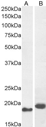 Approx. 18kDa band observed in lysates of cell line A431 and approx. 20kDa in nuclear lysates of cell line HeLa (calculated MW of 20.9kDa according to NP_001658.2). Recommended concentration: 0.5-1µg/ml.Primary incubation 1 hour at room temperature.