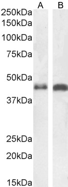 Approx 45kDa band observed in lysates of cell lines A549 and U251 and in preliminary testing of KNRK cell lysate (calculated MW of 46.1kDa according to NP_004304.1 and 44.4kDa according to NP_945355.1) Recommended concentration: 0.5-1µg/ml. Primary incubation 1 hour at room temperature.