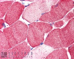 IHC Results In paraffin embedded Human Skeletal Muscle shows striated pattern staining of majority of muscular fibres. Recommended concentration, 5-10µg/ml. | |