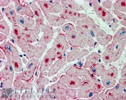 IHC Results In paraffin embedded Human Heart shows intense staining of distinct spots in the myocardial fibres in transverse section. Recommended concentration: 2-3µg/ml. | |