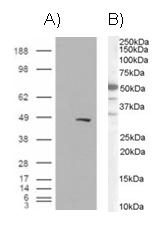 Approx 50kDa band observed in lysates of cell lines HEPG2, HeLa and Jurkat (calculated MW of 46.6kDa according to NP_003070.3). A 48kDa band was observed in transfected HEK293 transiently expressing BAF57. This band is not observed in the non-transfected HEK293. Recommended concentration: 0.2-0.6 µg/ml. Full caption: A) HEK293 overexpressing BAF57 (RC209444) and probed with EB06054 (mock transfection in first lane), tested by Origene. B) EB06054 staining (0.2µg/ml) of Jurkat lysate (RIPA buffer, 35µg total protein per lane). Primary incubated for 1 hour. Detected by western blot using chemiluminescence.
