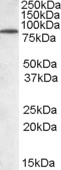 Approx 80kDa band observed in Human Brain (Cerebellum) and Rat Brain lysates and approx 85kDa band seen in Mouse Brain (calculated MW of 80.8kDa according to Human NP_006449.2, Mouse NP_001272799.1 and Rat NP_113974.1). Recommended concentration: 0.1-0.3µg/ml.