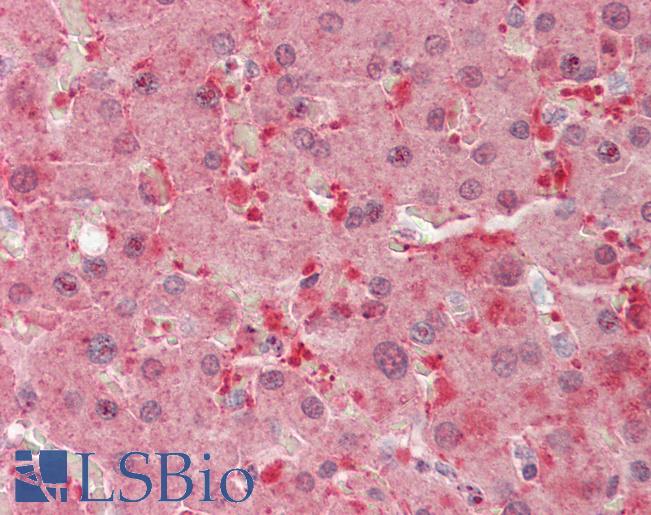 Paraffin embedded Human Spleen (erythrocytes) and Liver. Recommended concentration: 5µg/ml.
