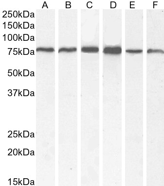 Western Blot Approx 75-80kDa band observed in Human Liver lysates and in lysates of cell. lines HeLa, Jurkat, MCF7, NIH3T3 and PC12 (calculated MW of 82.9kDa according to Human NP_001190.1 and, 93.5kDa according to Mouse NP_001409046.1, and Rat XP_006252347.1). This molecular weight is observed by other sources and was successfully blocked by incubation with the immunizing peptide, corresponding to the cleaved BMP-1 propeptide. Recommended concentration: 1-3µg/ml. Primary incubation 1 hour at room temperature. | |