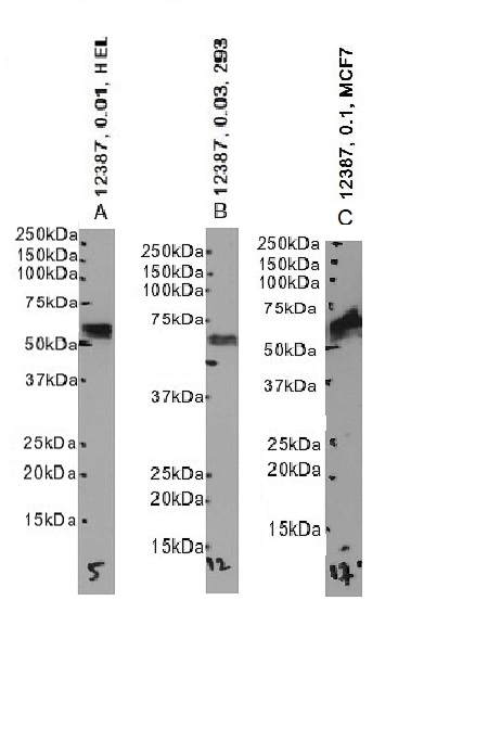 Western Blot Approx. 55-60kDa band observed in lysates of cell line HeLa, and approx. 60kDa in lysates of cell lines HEK293 and MCF7, and in Human Lung lysates (calculated MW of 48.1kDa according to NP_004334.1). These molecular weights are observed by other commercial sources. Recommended concentration: 0.01-0.5µg/ml. Primary incubation 1 hour at room temperature. Additional validation: This antibody has been successfully used in the following papers: Sikorski K. et al. (2018), PMID: 30377371; Costa. C. F. et al. (2023), PMID: 37371965. | |