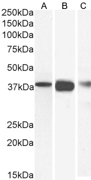Approx. 38kDa band observed in lysates of cell lines THP-1, U937 and A431, and in Human Spleen lysates and approx. 37kDa in Human Tonsil lysates (calculated MW of 38.5kDa according to NP_001738.2 and 36.9kDa according to NP_001243069.1). Recommended concentration: 0.1-0.3µg/ml. Primary incubation 1 hour at room temperature.