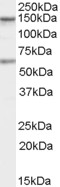 Approx 150+65kDa bands observed in lysates of cell line Jurkat (calculated MW of 133kDa according to NP_115791.2). Recommended concentration: 1-3µg/ml. An additional band of unknown identity was also consistently observed at 60kDa. This band was successfully blocked by incubation with the immunising peptide.