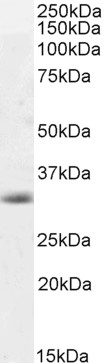 Western Blot Approx 32kDa band observed in lysates of cell line MOLT4 and in Mouse Liver lysates (calculated MW of 31.6kDa according to Human NP_004337.2 and 31.4kDa according to Mouse NP_033940.1, NP_001271338.1). An additional band of 65kDa was also consistently observed in MOLT4 and was successfully blocked by incubation with the immunizing peptide. Recommended concentration: 0.5-1µg/ml. Primary incubation 1 hour at room temperature. | |