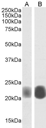 Western Blot Approx 22kDa band observed in lysates of cell lines A431 and A549 and in Human Heart lysates (calculated MW of 20.5kDa according to NP_001744.2). Recommended concentration: 0.001-0.01µg/ml. Primary incubation 1 hour at room temperature. Preliminary testing was unsuccessful on Pig Heart and Spleen, and Mouse and Rat Lung for this particular batch. | |