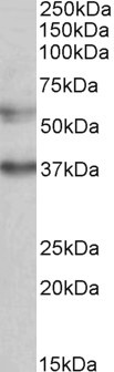 An additional band of unknown identity was also consistently observed at 37kDa. This band was successfully blocked by incubation with the immunizing peptide. | |