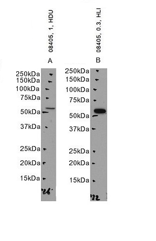 Western Blot Approx. 60kDa band observed in lysates of cell line THP-1, approx. 55kDa in Human Duodenum lysates, and approx. 55-60kDa in Human Liver lysates (calculated MW of 62.6kDa according to NP_001020366.1). These molecular weights are observed by other commercial sources. Recommended concentration: 0.5-1ug/ml. Primary incubation 1 hour at room temperature. | |