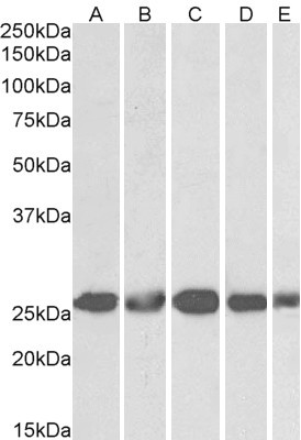 Western Blot Approx 26kDa band observed in lysates of cell lines NIH3T3, HeLa, K562, MCF7 and HepG2 (calculated MW of 24.9kDa according to NP_001311.3). Approx 25kDa band observed in Mouse Testis, 26kDa in Rat Testis and 28kDa in Pig Testis lysates (calculated MW of 24.9kDa according to Mouse NP_001290374.1, Rat NP_001030315.1 and pig NP_001138849.1). This molecular weight is routinely observed by other sources. Recommended concentration: 0.3-1µg/ml. | |
