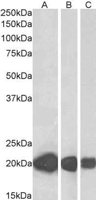 Western Blot Approx. 20kDa band observed in Human, Mouse and Rat Heart lysates (calculated MW of 21.0kDa according to Human NP_003467.1 and 20.8kDa according to Rat NP_476485.1). Recommended concentration: 0.01-0.03µg/ml. Primary incubation was 1 hour. | |