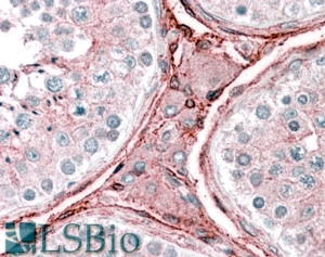 In paraffin embedded Human Testis shows membranous staining in primarily myofibroblasts of the basement membrane surrounding the seminiferous tubules. Recommended concentration: 2-5µg/ml. Paraffin embedded Human Small Intestine. Recommended concentration: 2.5ug/ml.