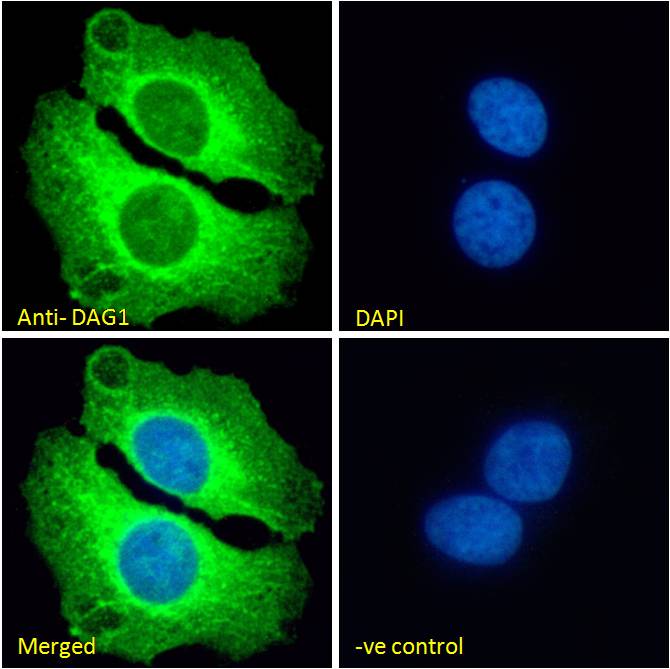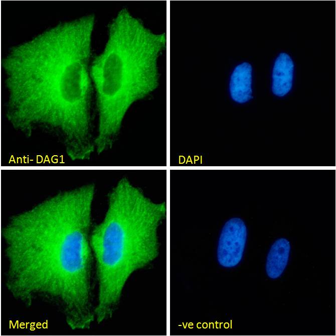 Usage Summary Immunofluorescence: Strong expression of the protein seen in the ER and cytoplasm of HeLa and U2OS cells. Recommended concentration: 10µg/ml.