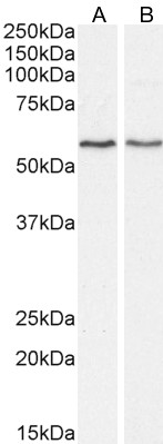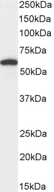 Western Blot Approx. 55-58kDa band observed in lysates of cell line NIH3T3, and approx. 58kDa in Mouse Duodenum and Rat Kidney lysates (calculated MW of 56.8kDa according to Mouse NP_034176.1 and 57.1kDa according to Rat NP_445889.2). Recommended concentration: 0.3-1µg/ml. Primary incubation 1 hour at room temperature. | |
