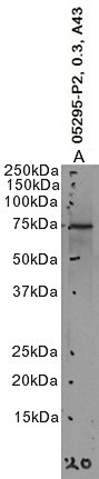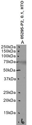 Approx. 75kDa band observed in lysates of cell line A431 and in Human Tonsil lysates (calculated MW of 70.0kDa according to NP_ 078988.2). Recommended concentration: 0.1-0.3µg/ml. Primary incubation 1 hour at room temperature.