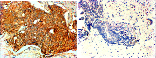 In paraffin embedded Human breast cancer shows cell membrane and cytoplasm staining in the affected cells of Her+ type and not in triple negative type. Recommended concentration: 4-6µg/ml.