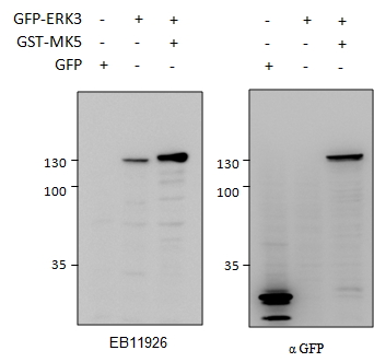 Usage Summary Immunoprecipitation: MK5/ERK3 double knockout Mouse Embryonic Fibroblasts (MEFs) retrovirally transduced with MK5/ERK3 or empty vector (GFP) were lysed from confluent plates and used for IP with 1.5ug EB11926. Western blots of the IP were labelled with rabbit anti-ERK3 serum (CST) or with mouse anti-MK5 (SC). An approx 100kDa of ERK3 is only precipitated from lysates of those KO MEFs that have been rescued by the ERK3/MK5 expression construct as described in as described in PMID: 22508986. Data obtained from Dr. M. B. Menon, Inst. Biochemistry, Hannover Medical School, Germany. | |