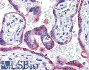 IHC Results In paraffin embedded Human Placenta shows staining of syncytiotrophoblasts. Recommended concentration, 3-5µg/ml. | |