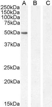 Western Blot Approx 50kDa band observed in nuclear lysates of cell line K562 (calculated MW of 42.8kDa according to NP_002040.1). The observed molecular weight corresponds to different antibodies from other sources and was successfully blocked by incubation with the immunizing peptide. Recommended concentration: 1-3µg/ml. Primary incubation 1 hour at room temperature. Negative Control: Human Hippocampus lysate. | |