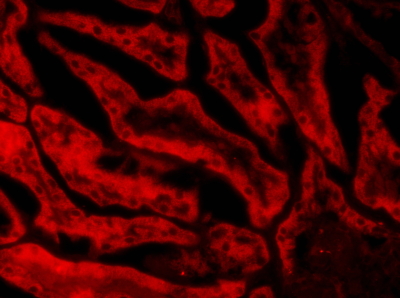 Frozen sections of Porcin Kidney shows staining of cytoplasm in PCT epithelial cells. Recommended concentration: 20µg/ml. | |