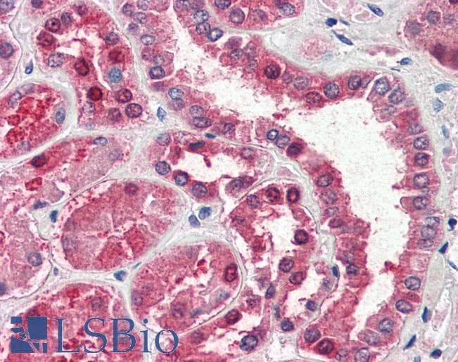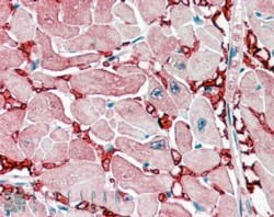 In paraffin embedded Human Heart shows strong staining of the capillary network between the myocardial fibres in transverse secion. Recommended concentration: 2-3µg/ml. Paraffin embedded Human Kidney. Recommended concentration: 5µg/ml.