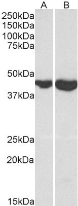 Western Blot Approx 45kDa band observed in lysates of cell line HepG2, and of Mouse Brain and Heart (calculated MW of 47.5kDa according to human NP_002071.2 and 47.4kDa accordnig to mouse NP_034455.1). Recommended concentration: 0.3-1µg/ml. | |