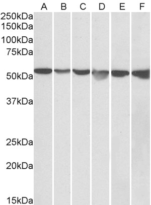 Western Blot Approx 60kDa band observed in Human Heart lysates and approx 55kDa observed in lysates of cell lines HeLa, A431, A549, MCF7, Jurkat and K562 (calculated MW of 63.1kDa according to NP_000166.2). Recommended concentration: 0.1-0.3µg/ml. Primary incubation was 1 hour. | |