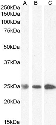 Western Blot Approx 25kDa band observed in Human Kidney, Lung and Thymus lysates, lysates of cell lines HeLa, HEK293, Jurkat, CaCo-2, K562, NIH3T3, KNRK and MDCK, and, in nuclear lysates of cell lines HeLa, HEK293 and Jurkat (calculated MW of 23.4kDa according to Human NP_000843.1 and Rat NP_036709.1, 23.6kDa according to Mouse NP_038569.1 and 23.5kDa according to. Canine NP_001239096). Recommended concentration: 0.03-0.3µg/ml. Primary incubation 1 hour at room temperature. | |