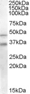 Approx 35kDa band observed in Human Placenta lysates (calculated MW of 34.5kDa according to NP_057399.1). Recommended concentration: 0.2-0.6µg/ml. An additional band of unknown identity was also consistently observed at approx.46kDa. This band was successfully blocked by incubation with the immunising peptide.