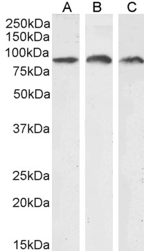 Approx 90kDa band observed in Human and Mouse Lung and in Human Kidney lysates and approx 85-90kDa in Human Gastrointestinal cancer lysates (calculated MW of 92.7kDa according to Human NP_001521.1, 82.7kDa according to Human NP_851397.1 and 93.7kDa according to Mouse NP_001300848.1). Recommended concentration: 0.3-1µg/ml. Primary incubation 1 hour at room temperature.