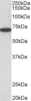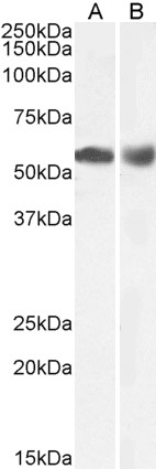 Western Blot Appox 55kDa band observed in Human Duodenum and Lymph Node lysates and approx 70kDa band observed in lysates of cell lines HeLa and NIH3T3 (calculated MW of 55.1kDa according to Human NP_004955.2 and Mouse NP_032254.1). The observed 70kDa band represents the sumoylated protein according to David et al, J Biol Chem. 2002 Jun 28;277(26):23658-63; PMID: 11960997. Recommended concentration: 0.1-2µg/ml. | |