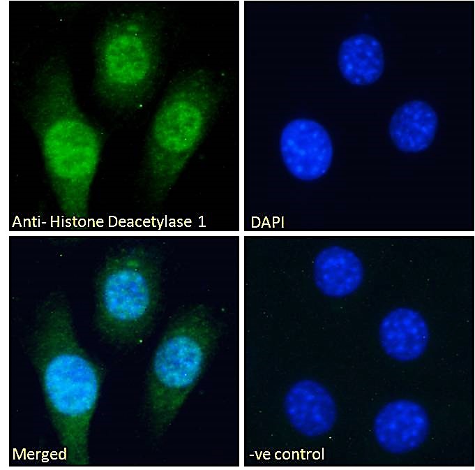 Usage Summary Immunofluorescence: Strong expression of the protein seen in the nucleus of NIH3T3 cells. Recommended concentration: 10µg/ml Chromatin Immunoprecipitation: A 3.5-fold increased presence of H3 onto the Human P21 locus observed when comparing the precipitations using EB07186 with non-specific goat IgG to bring down HDAC1 in a chromatin lysate from MCF7 cells. | |