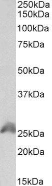 Western Blot Approx 26kDa band observed in lysates of cell lines HEK293, CACO-2 and MRC5 PD19 (calculated MW of 25.4kDa according to NP_061825.2). Recommended concentration: 1-3µg/ml. | |