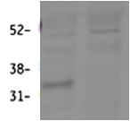 Western Blot Approx 32kDa band observed in Mouse Lung lysates (calculated MW of 32.4kDa according to NP_032314.2). Recommended concentration: 0.3-1µg/ml. An additional band of unknown identity was also consistently observed at 45kDa. This band was successfully blocked by incubation with the immunizing peptide. However, it remained visible in a KO background. | |