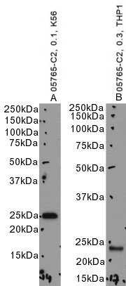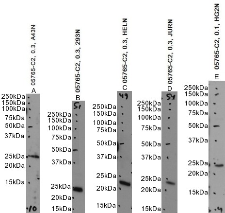 Approx. 23-24kDa band observed in nuclear lysates of cell lines HeLa, Jurkat, HEK293, HepG2 and in THP-1 cell lysates, and approx. 25kDa in lnuclear lysates of cell line A431 and in K562, cell lysatess (calculated MW of 22.5kDa according to NP_054895.1). Recommended concentration: 0.1-0.3µg/ml. Primary incubation 1 hour at room temperature.