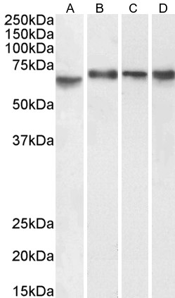 Western Blot Approx 65kDa band observed in lysates of cell line Caco-2 and approx. 70kDa in lysates of cell line K562 and in nuclear cell lysates of HepG2 and NIH3T3 (calculated MW of 63.5kDa according to Human NP_006537.3 and Mouse NP_034081.1). Recommended concentration: 0.1-1µg/ml. Primary incubation 1 hour at room temperature. Positive Control: A batch specific positive control lysate is available for this product. Please contact [email protected] for availability. | |