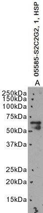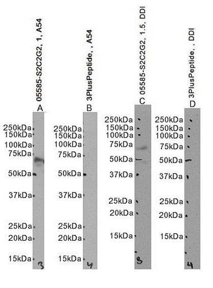 Approx. 55+60kDa bands observed in Human Spleen lysates, approx. 65kDa in lysates of cell line A549, and approx. 70kDa in lysates of cell lines Daudi (calculated MW of 57.8kDa according to NP_001092099.1). These molecular weights have been observed by other commercial sources, and were successfully blocked by incubation with the immunizing peptide. Recommended concentration: 1-2µg/ml. Primary incubation 1 hour at room temperature.