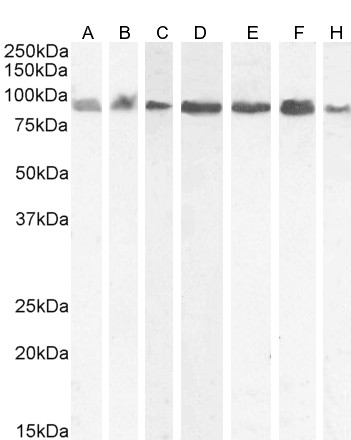 Western Blot Approx 90-95-kDa band observed in lysates of cell lines A431, Daudi, HEK293, HeLa, Jurkat, Kelly and KNRK (calculated MW of 97.2kDa according to Human NP_002256.2 and Rat NP_058759.2). Recommended concentration: 0.01-0.1µg/ml. Primary incubation 1 hour at room temperature. | |