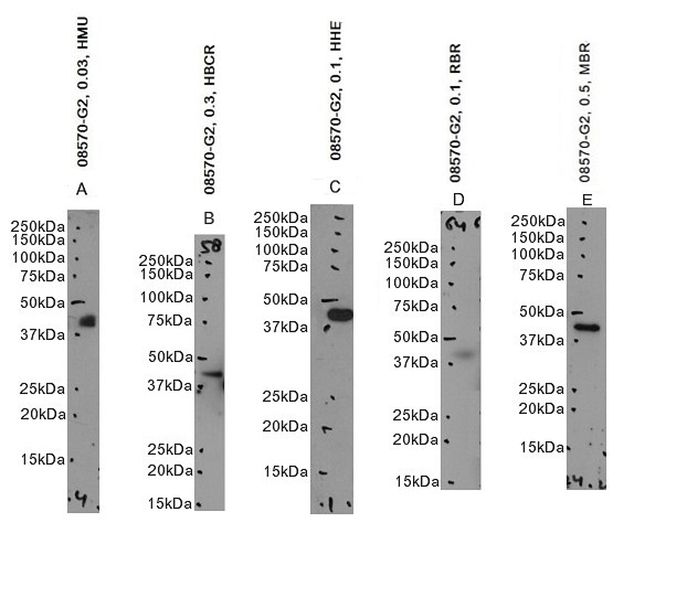 Western Blot Approx. 38-40kDa band observed in Human Cerebellum, Heart and Skeletal Muscle lysates and in Mouse and Rat Brain lysates (calculated MW of 37.2kDa according to Human NP_005661.1, 37.0kDa according to Mouse NP_034276.2 and 37.1kDa according to Rat NP_001263691.1). Recommended concentration: 0.03-0.5µg/ml. Primary incubation 1 hour at room temperature. | |