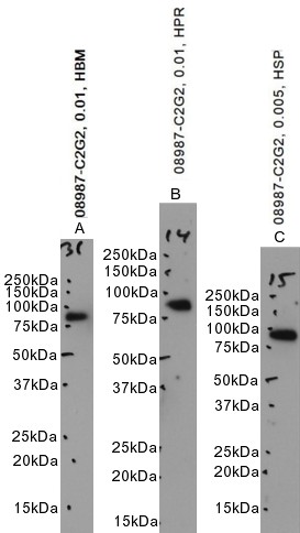 Western Blot Approx. 80kDa band observed in Human Bone Marrow and Prostate lysates, and approx. 85kDa in Human Spleen lysates (calculated MW of 78.2kDa according to NP_002334.2). Recommended concentration: 0.005-0.01µg/ml. Primary incubation 1 hour at room temperature. | |