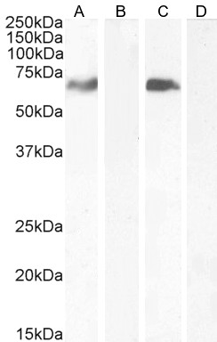 Approx 70kDa band observed in Human Cerebellum and Mouse Brain lysates, and in lysates of cell line U251 (calculated MW of 75.3kDa according to Human NP_113605.2 and 75.4kDa according to Mouse NP_001355356.1). This band was succefully blocked by incubation with the immunising peptide. Recommended concentration: 0.3-1µg/ml. Primary incubation 1 hour at room temperature.