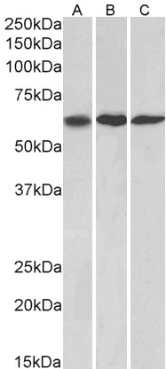 Western Blot Approx 60kDa band observed in lysates of cell lines NIH3T3, A549 and HeLa (calculated MW of 65.9kDa according to NP_004986.1). Recommended concentration: 1-3µg/ml. Primary incubation was 1 hour. | |
